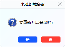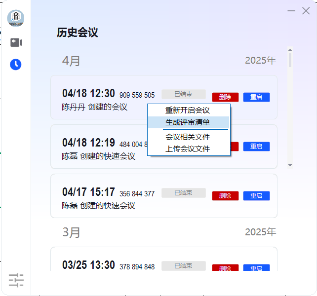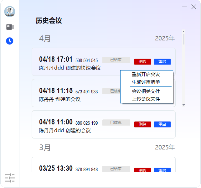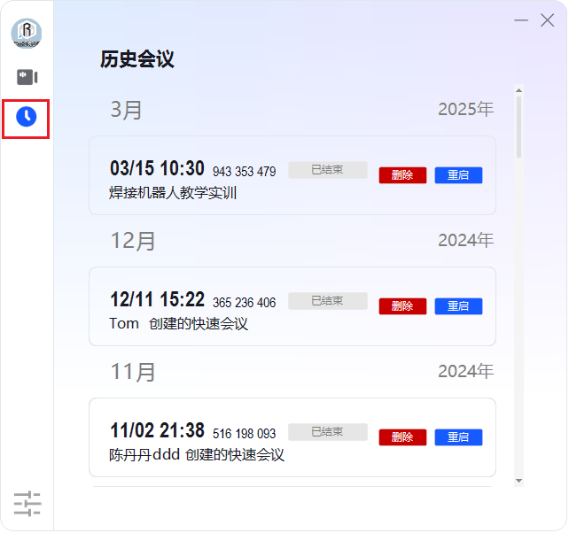 1、历史会议维护 历史会议里记录之前账号创建的所有会议,如需重新开启会议,只要选择对应会议双击会议即可,点击重新开启会议即可。 选择重启按钮: 例如:会议重启
