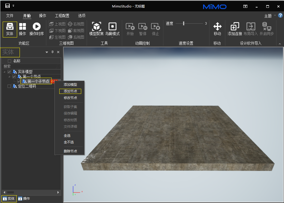 选择主工具栏中的【实体】按钮,显示大纲树,在大纲树节点的鼠标右键菜单中,选择【添加节点】,显示如下图所示: